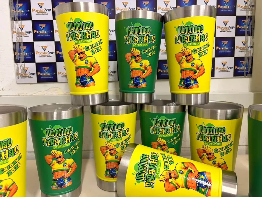 Várias canecas (ou copos) no mesmo estilo: para turma, pessoal do futebol, rolê com a galera. É kit pra quem vive junto, não pro embrulho.